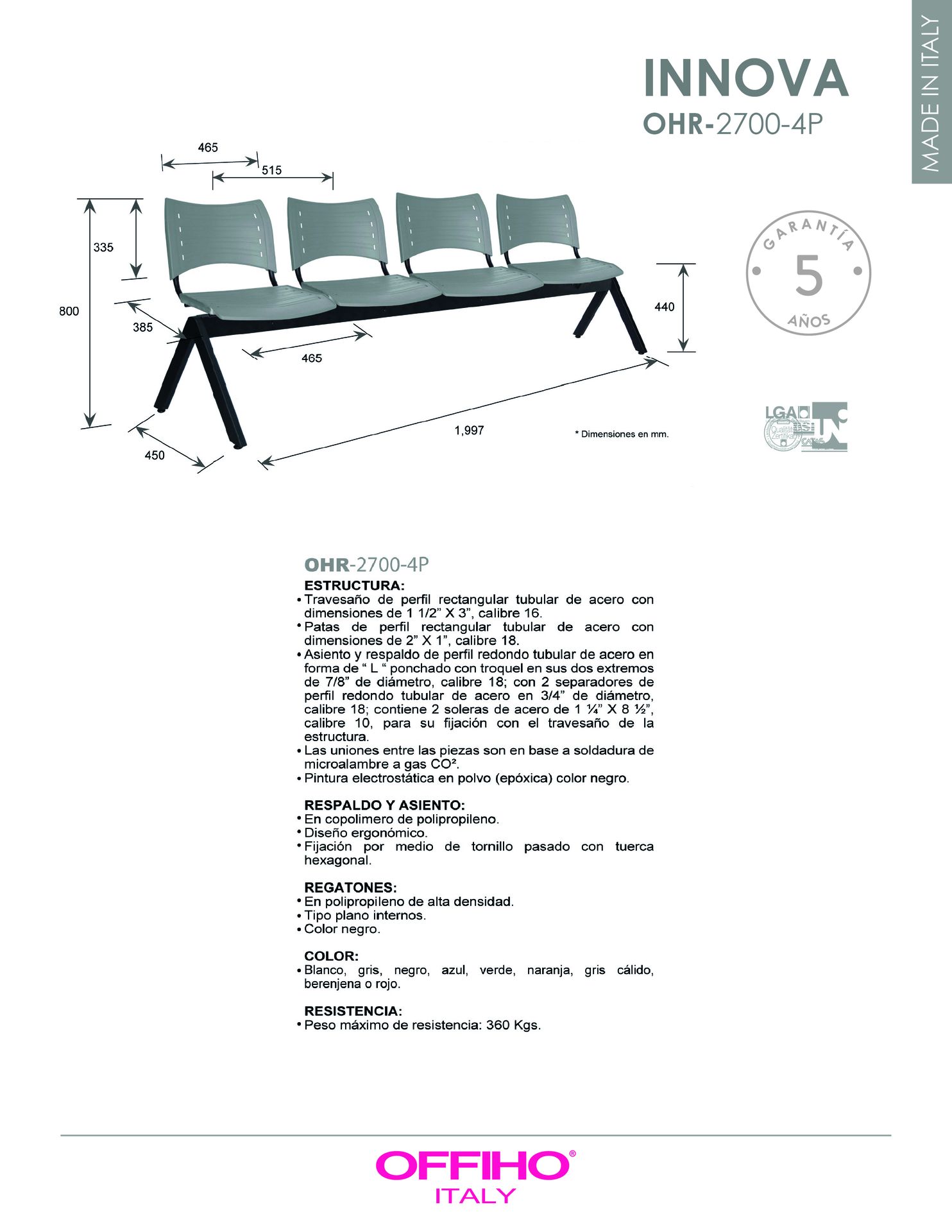 estructura: de acero tubular rectangular de 1 1/2" X 3", calibre 16, asientos y respaldos de perfil redondo tubular ponchado de acero con travesaños separadores tubulares redondos de acero con acabado de pintura epóxica (electrostática) color negro.