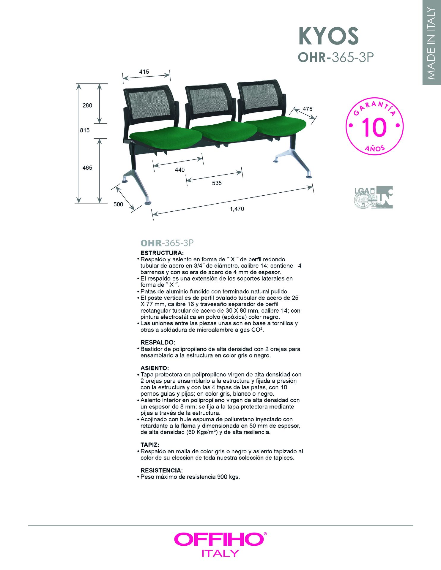 asiento: hule espuma de poliuretano inyectado flexible con densidad de 60 kgs/m3 con retardante a la flama y alta resiliencia.
