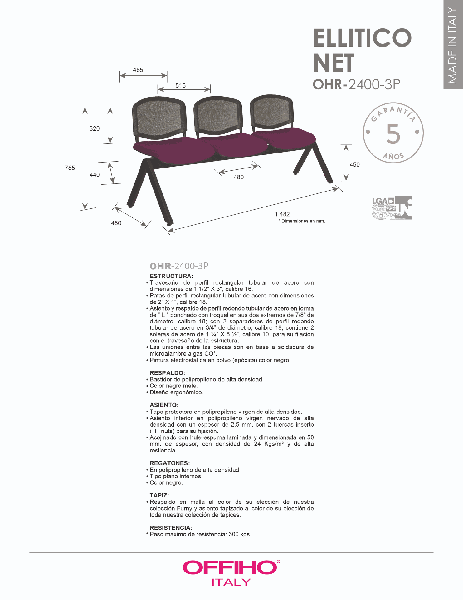 BANCA ELLITICO NET 3 PLAZAS ASIENTO TAPIZADO RESPALDO MALLA