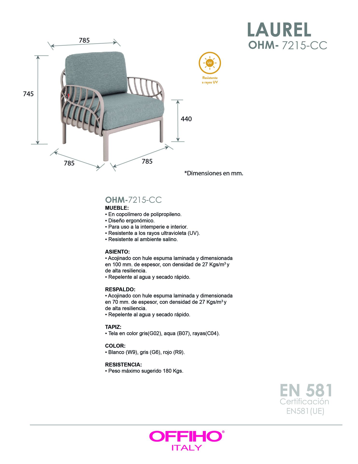 mueble: en polipropileno de alta resistencia y duración para intemperie e interior, resistente a los rayos ultravioleta (UV) y al ambiente salino.