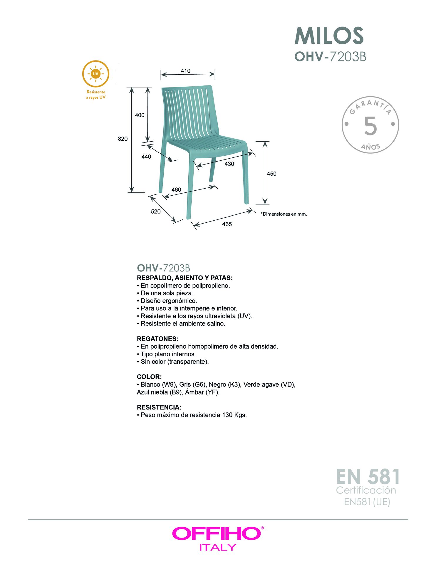 patas, asiento y respaldo: de una sola pieza en polipropileno de alta resistencia y duración para intemperie, resistente a los rayos ultravioleta (UV) y al ambiente salino.