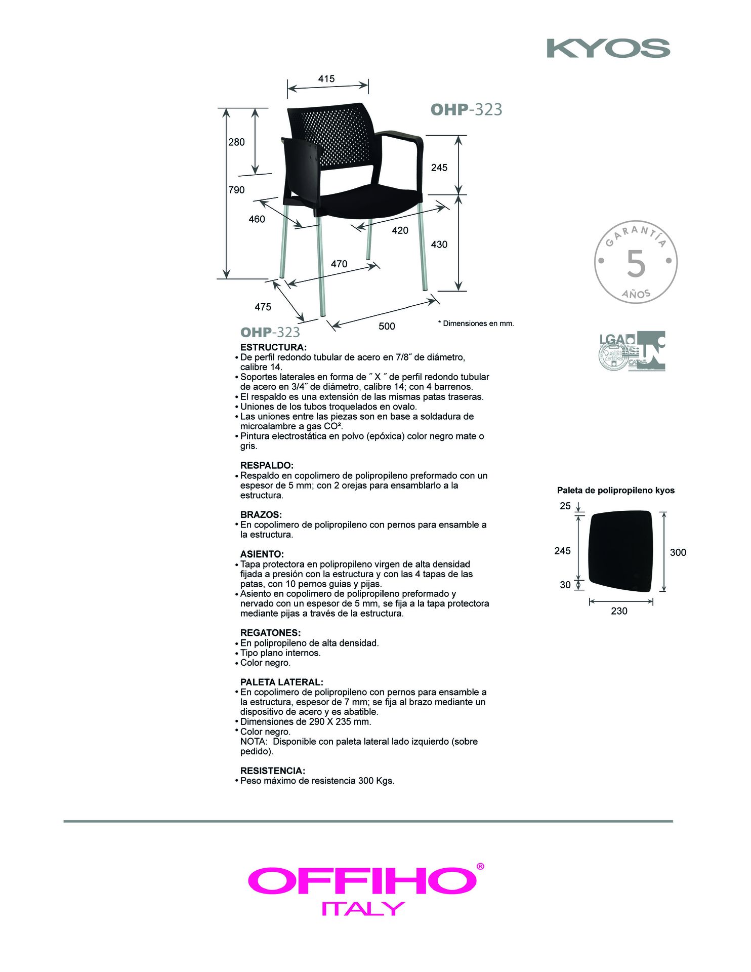 asiento y respaldo: en polipropileno de alta resistencia y duración.