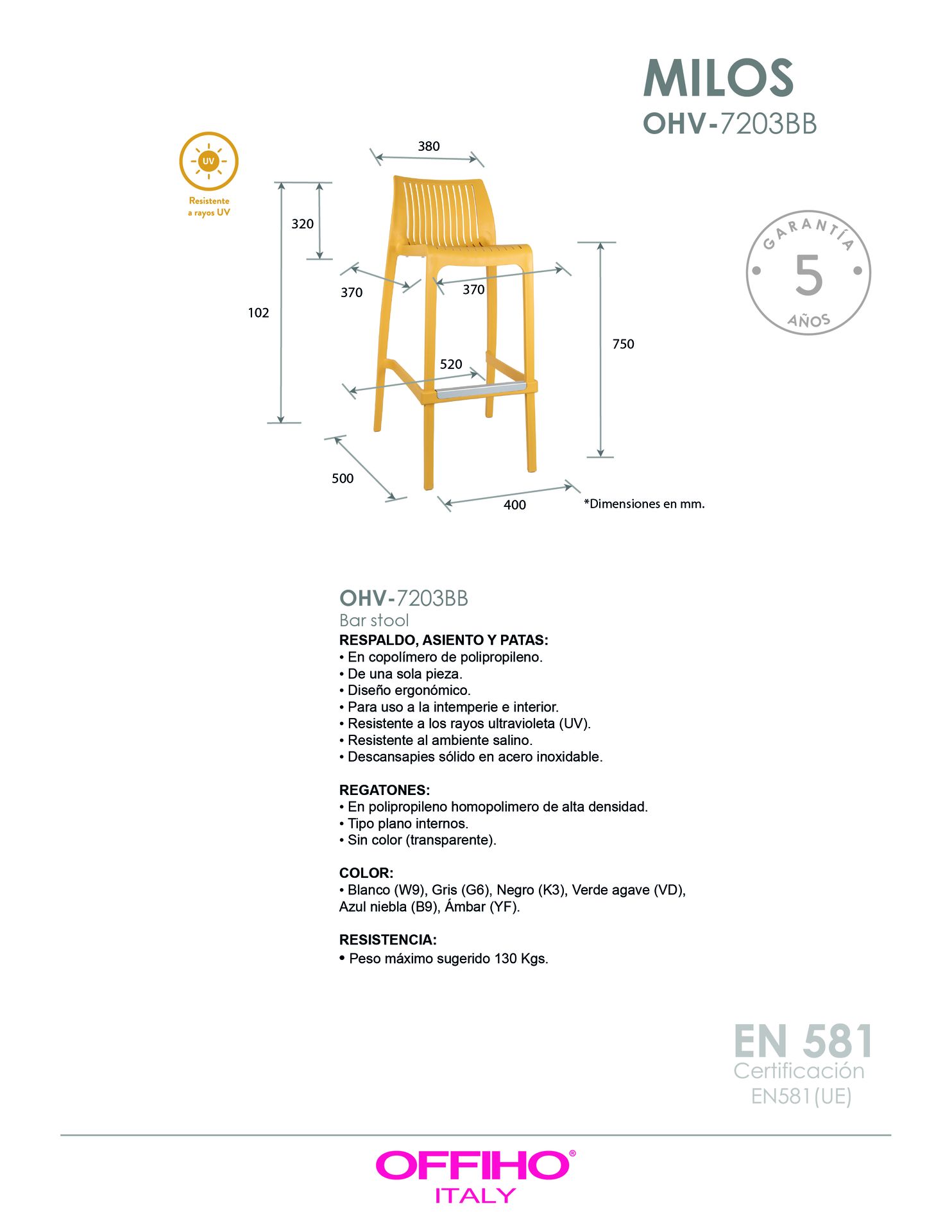 patas, asiento y respaldo: de una sola pieza en polipropileno de alta resistencia y duración para intemperie, resistente a los rayos ultravioleta (UV) y al ambiente salino.
