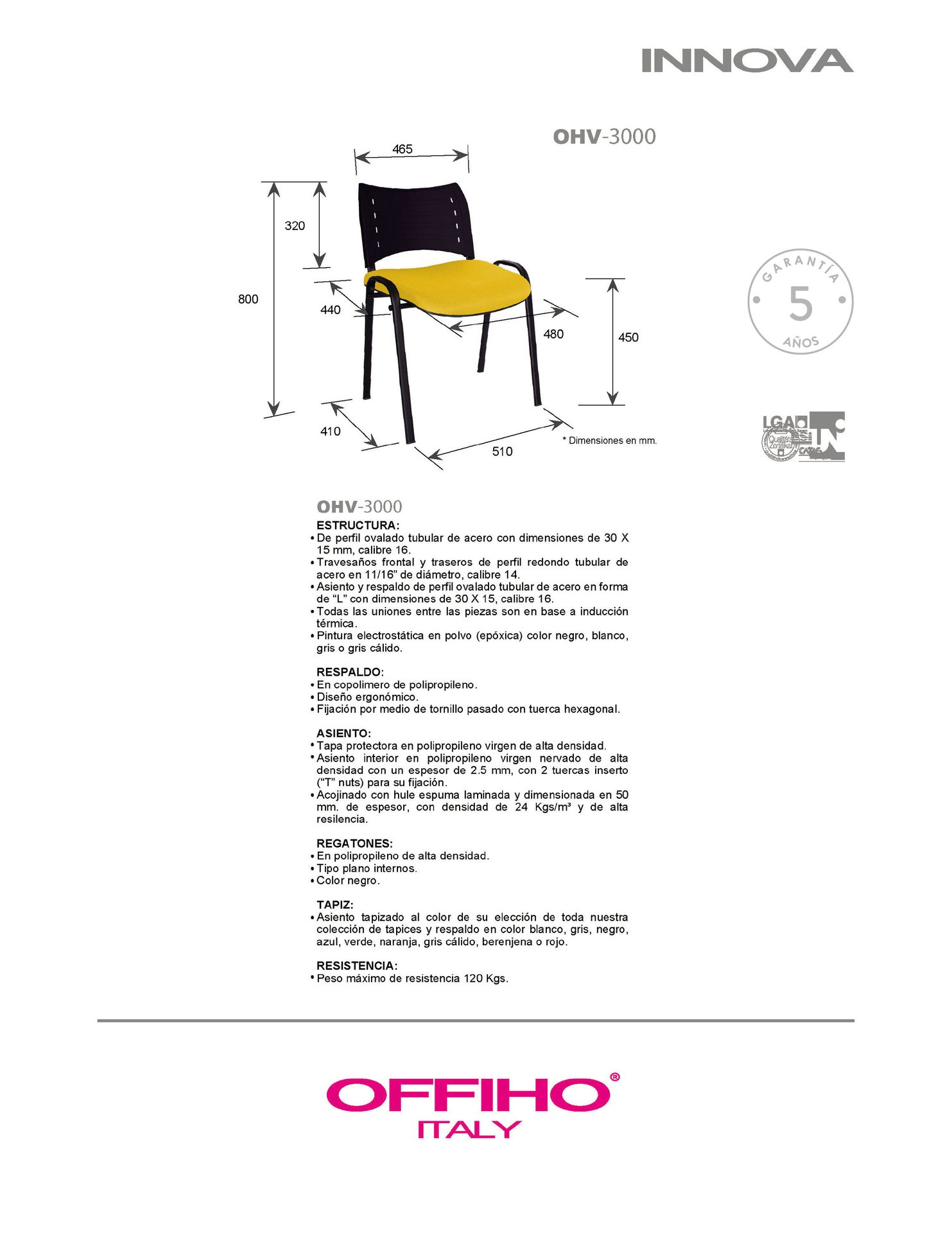 respaldo: en polipropileno de alta resistencia y duración.