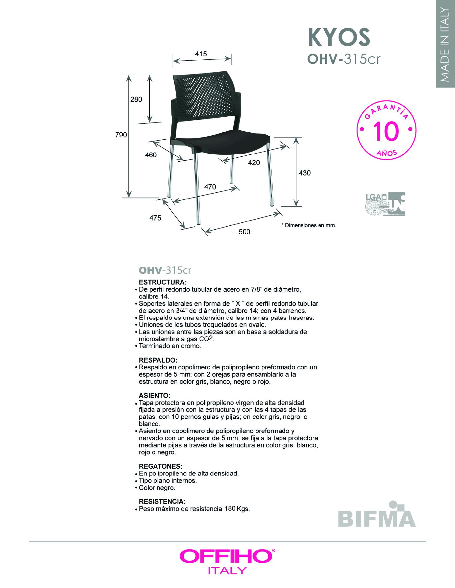 asiento y respaldo: en polipropileno de alta resistencia y duración.