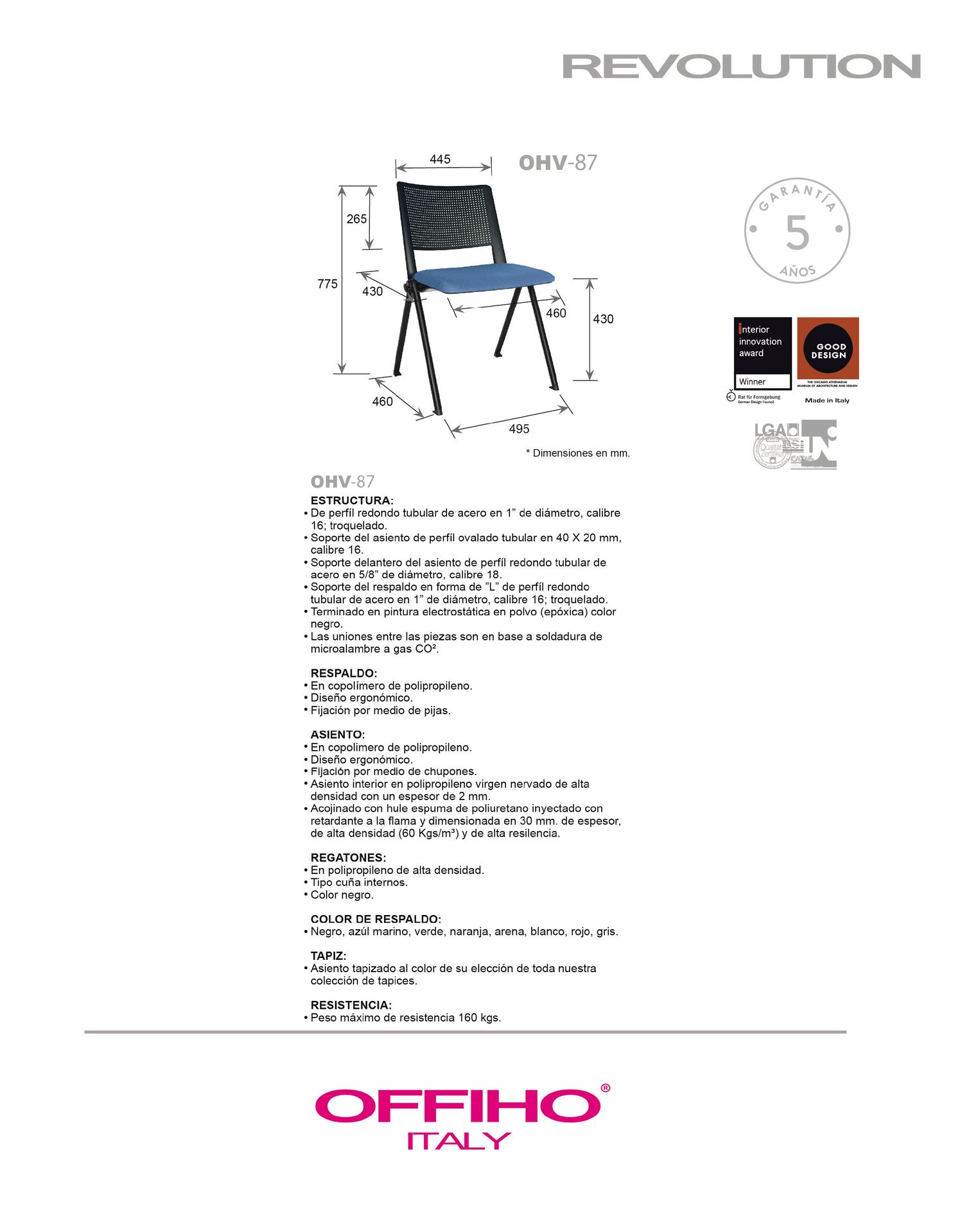 respaldo: en una pieza en polipropileno de alta resistencia y duración.