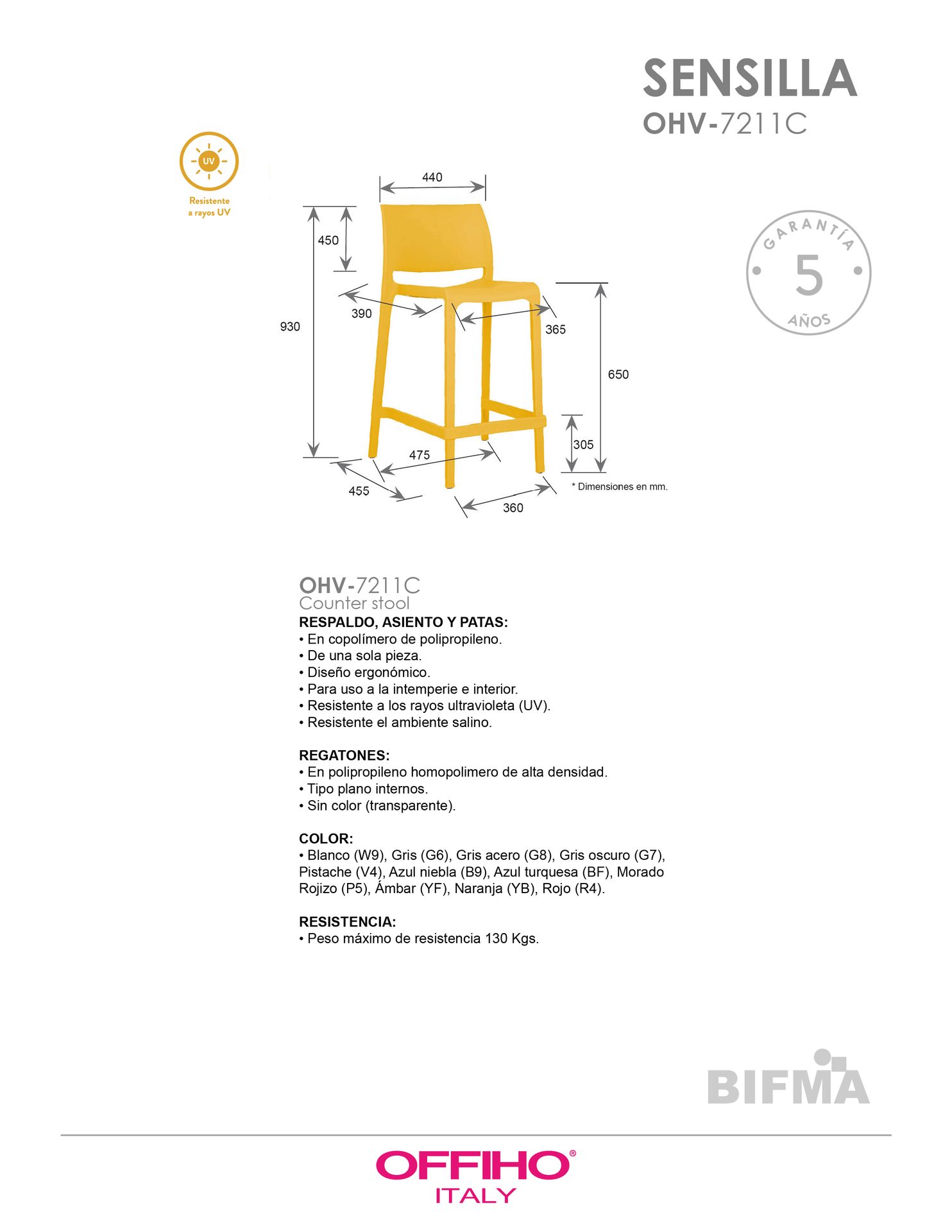 de una sola pieza en polipropileno de alta resistencia y duración para intemperie, resistente a los rayos ultravioleta (UV) y al ambiente salino.