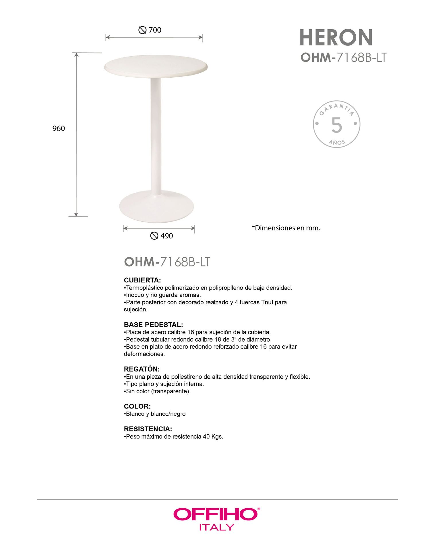 en forma redonda con pedestal de acero. Pintura electrostática en polvo (epóxica).
