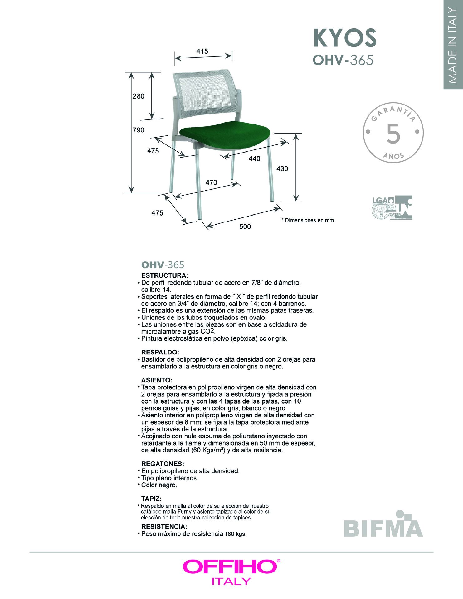 asiento: hule espuma de poliuretano inyectado flexible con densidad de 60 kgs/m3 con retardante a la flama y alta resiliencia.