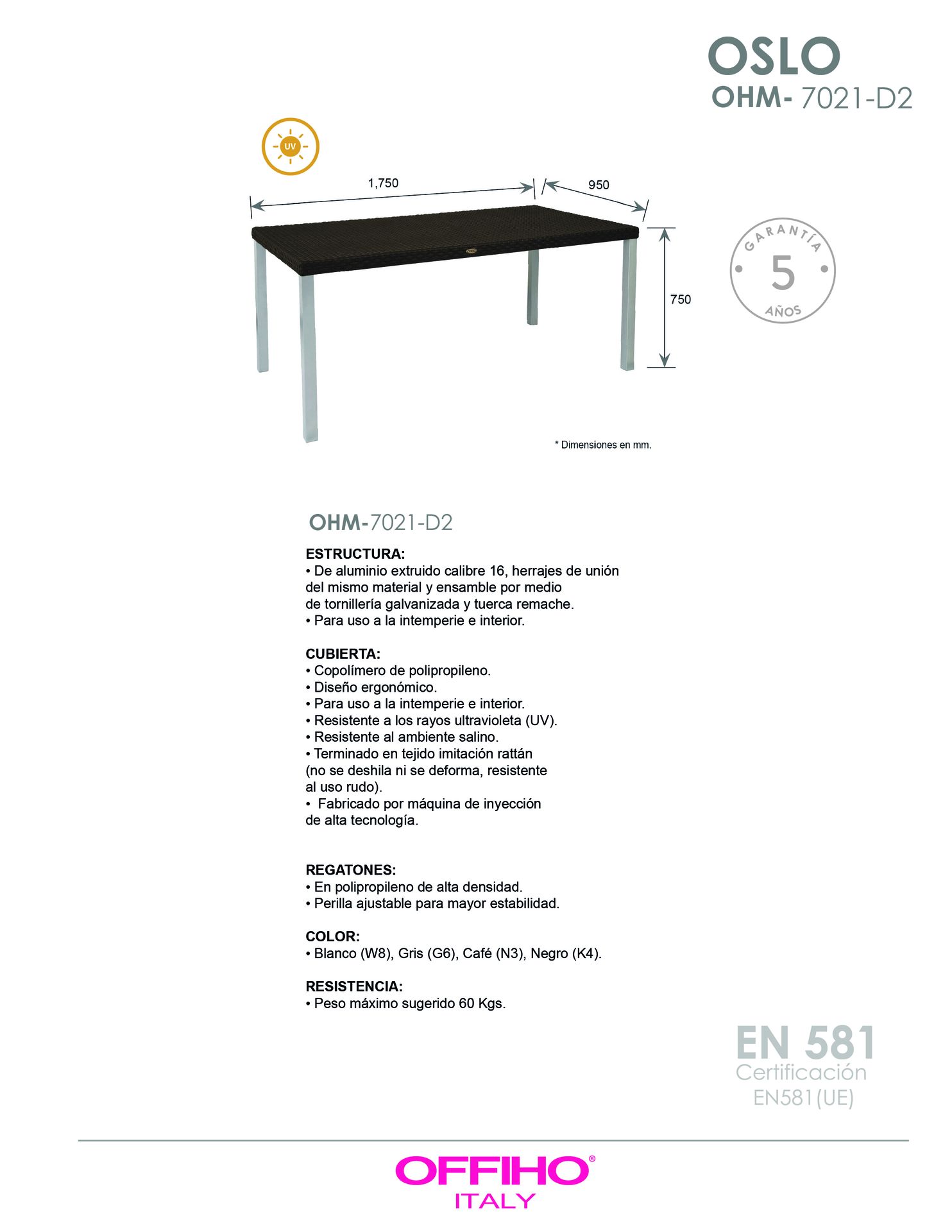 cubierta: En copolímero de polipropileno, diseño ergonómico; para uso a la intemperie e interior. Resistente a los rayos ultravioleta (UV) y al ambiente salino. Terminado en imitación rattán.