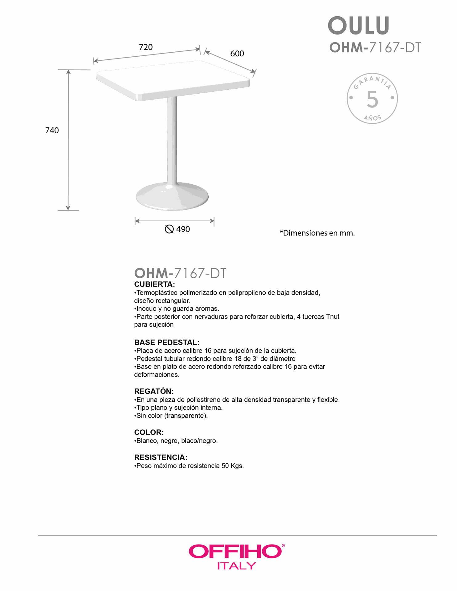 en forma redonda con pedestal de acero. Pintura electrostática en polvo (epóxica).