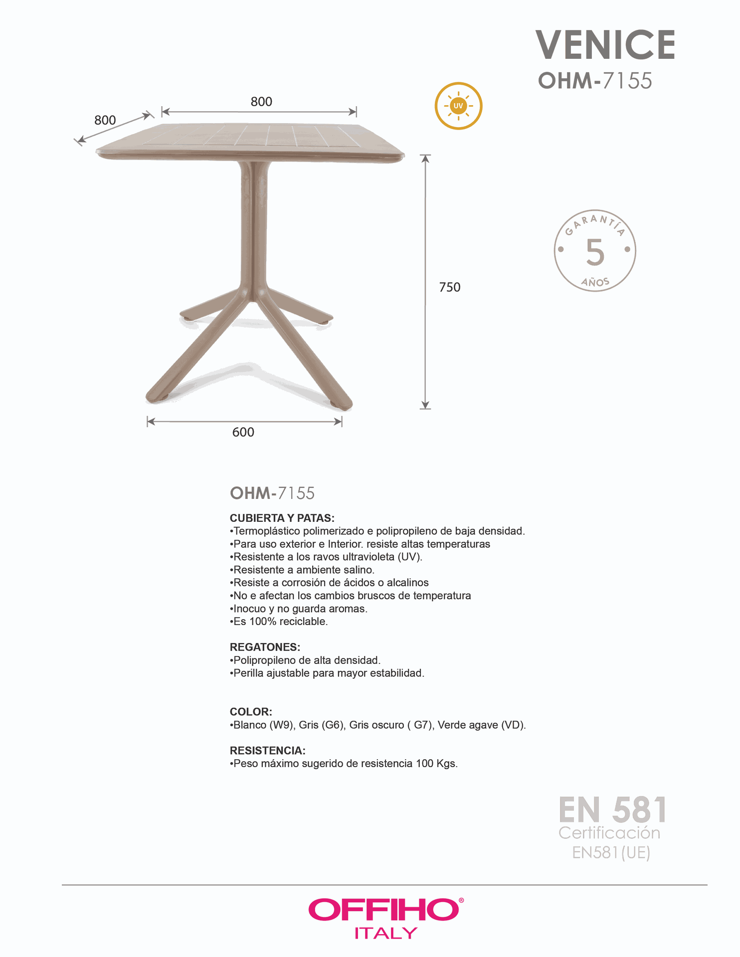 mesa: en termoplástico polimerizado de polipropileno de baja densidad para intemperie e interior, resistente a los rayos ultravioleta (UV), al ambiente salino, a los cambios bruscos de temperatura y a corrosión de ácidos alcalinos; es inocuo y no guarda aromas.