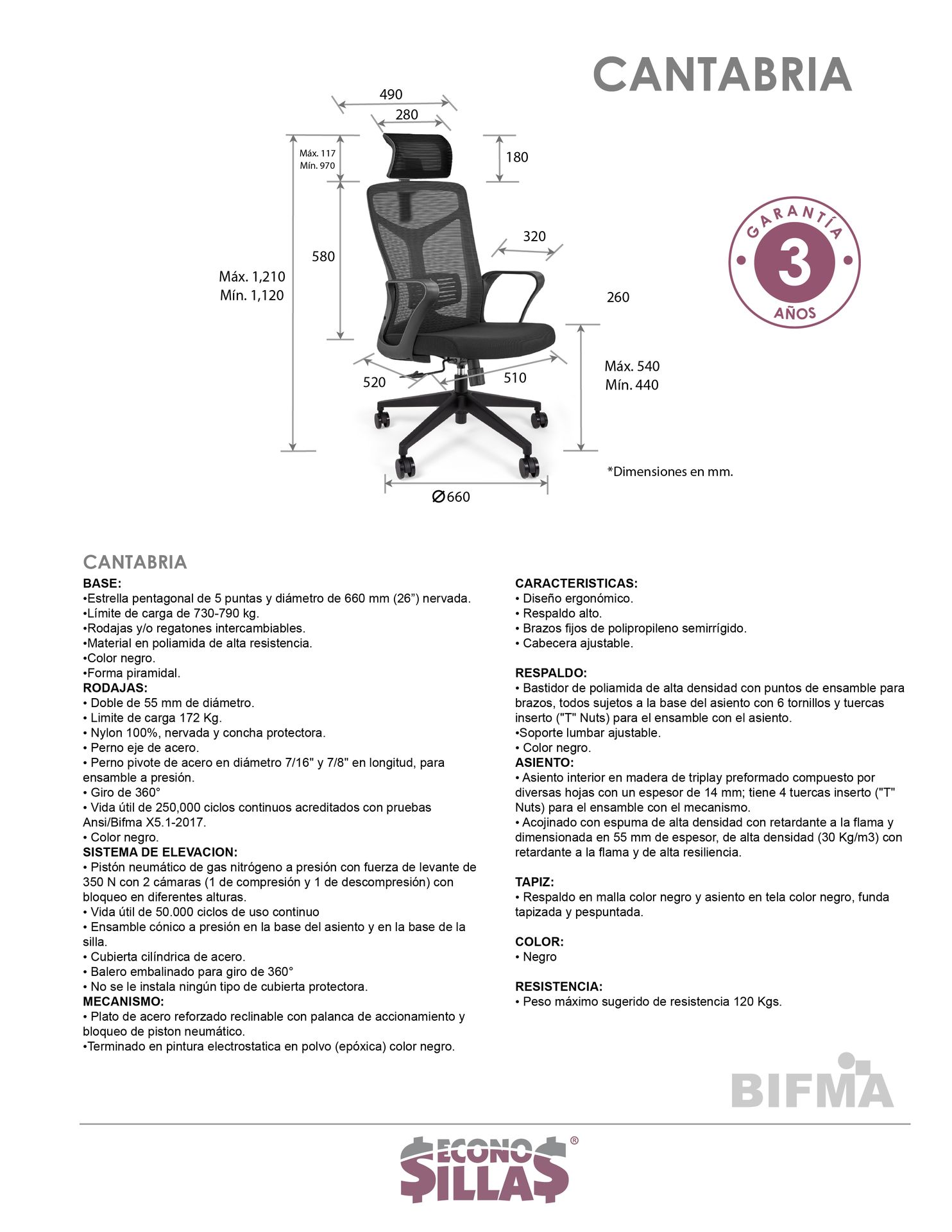 resistencia: peso sugerido 120 kgs. Uso comercial ligero.