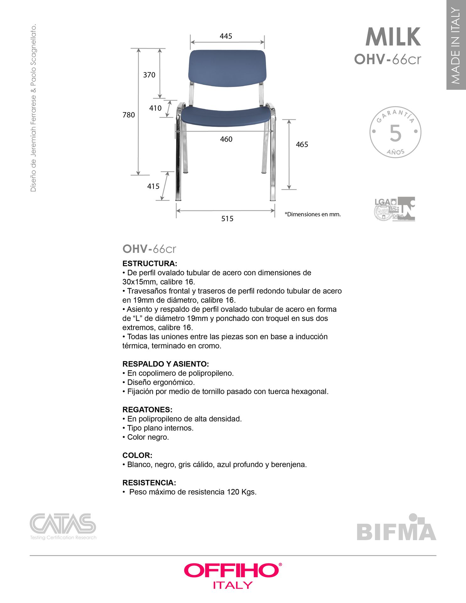 estructura: de acero tubular ovalado de 30 x 15 mm, calibre 16; travesaños de acero tubular redondo de 19 mm, calibre 16 y asiento y respaldo de acero tubular ovalado de 30 X 15 mm, calibre 16 con terminado en cromo.