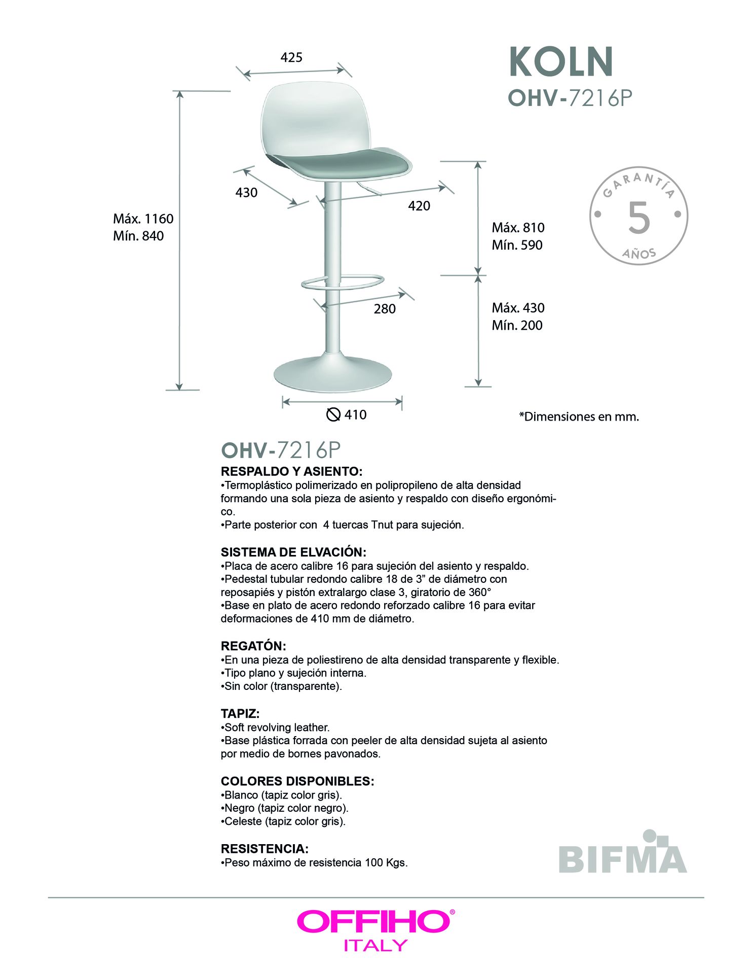 Elevación: por medio de pistón neumático extralargo clase 3 que permite ajustar la altura del asiento.