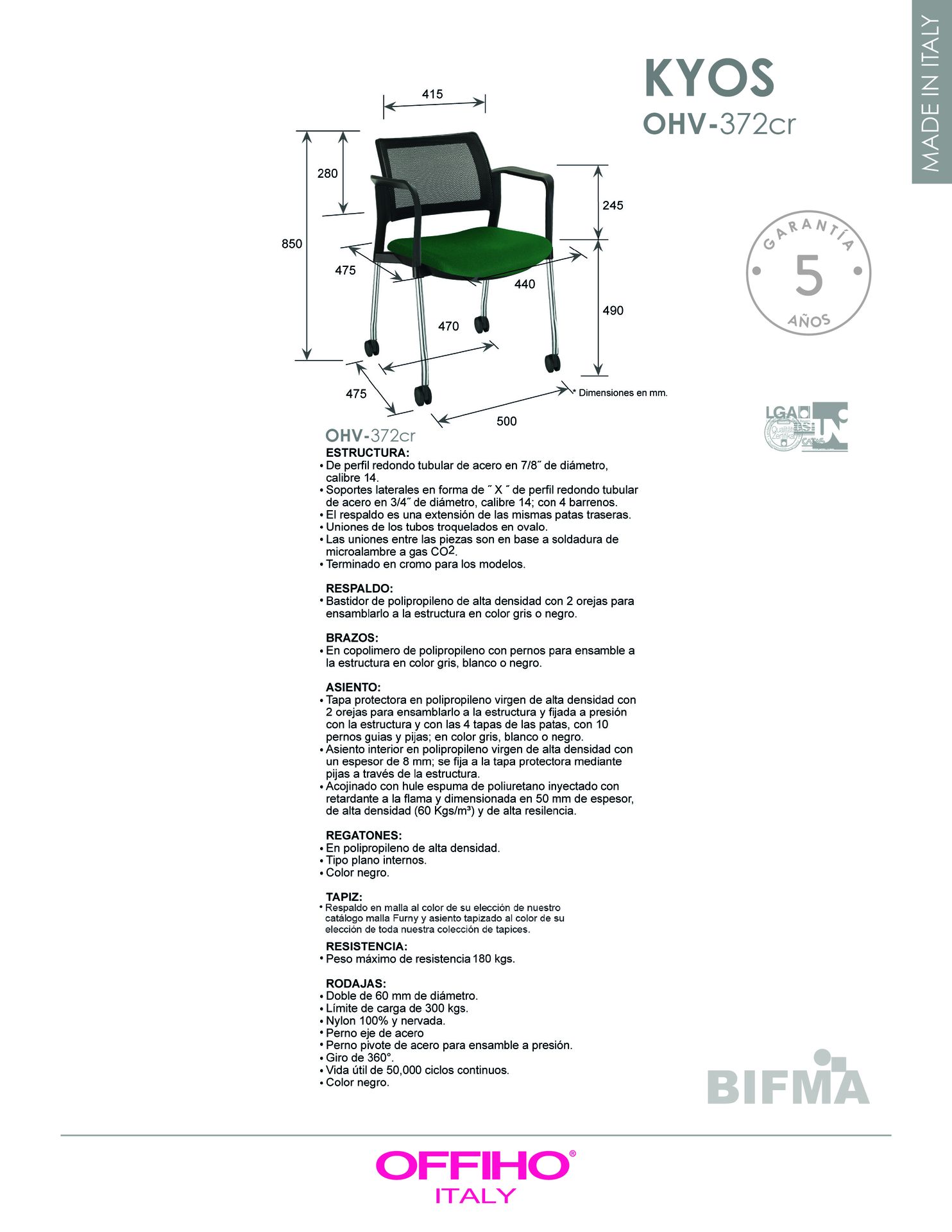 estructura: de acero tubular de 7/8" de diámetro, calibre 14; terminado en cromo, con rodajas giratorias tipo dual en color negro y con descansabrazos de polipropileno en color gris o negro.