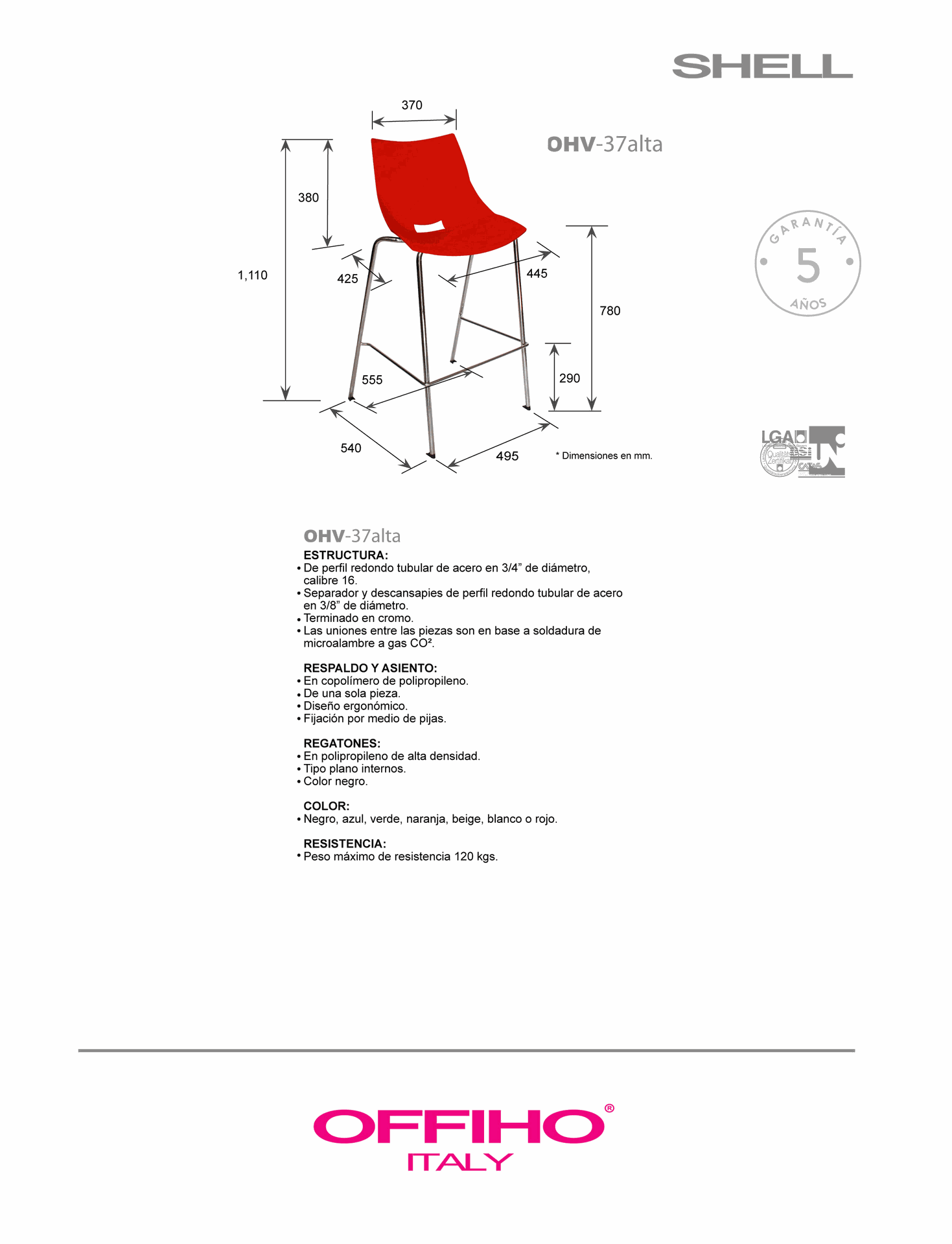 SILLA SHEL ALTA POLIPROPILENO EXPUESTO