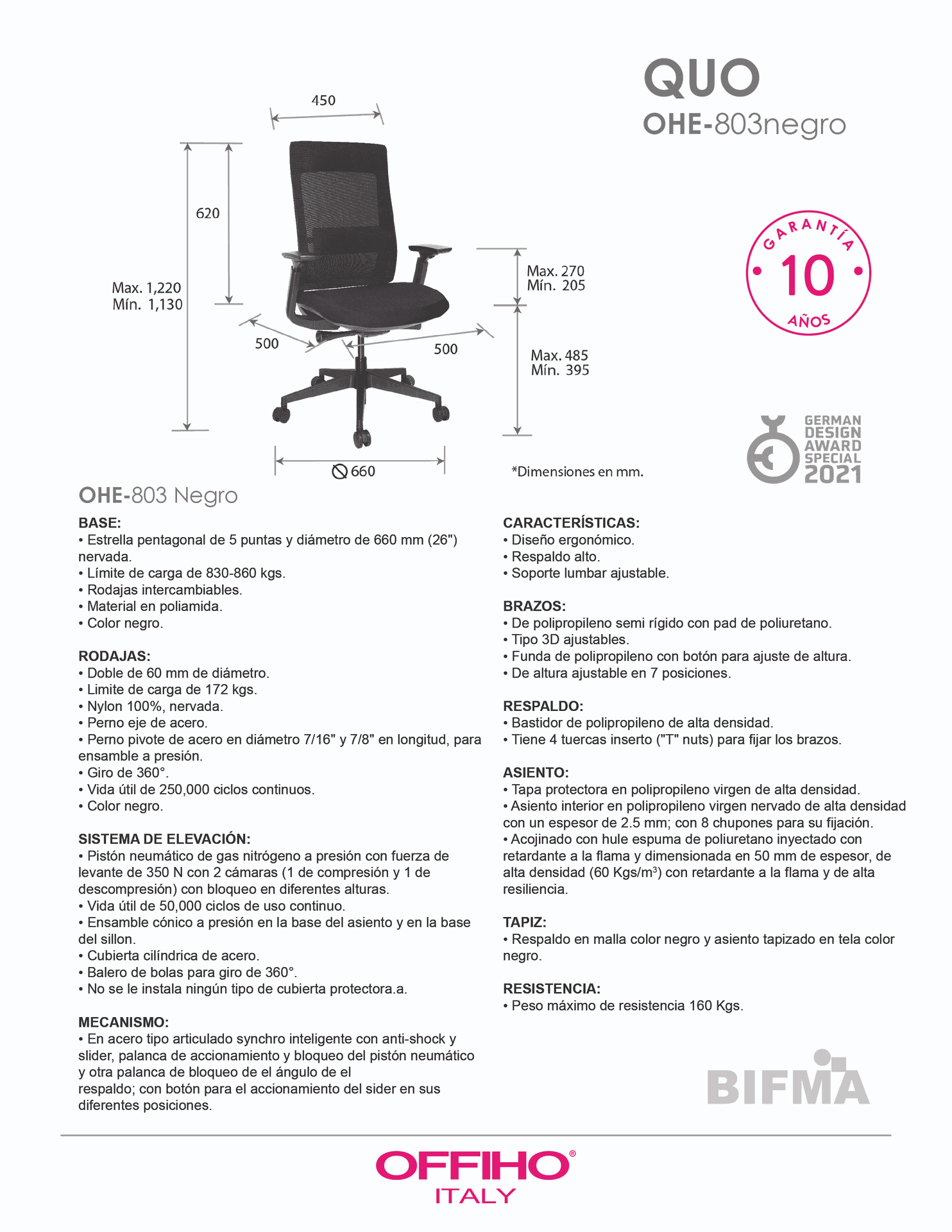 Brazos: tipo 3D giratorios y ajustables de altura en polipropileno semi-rígido con pad de poliuretano.