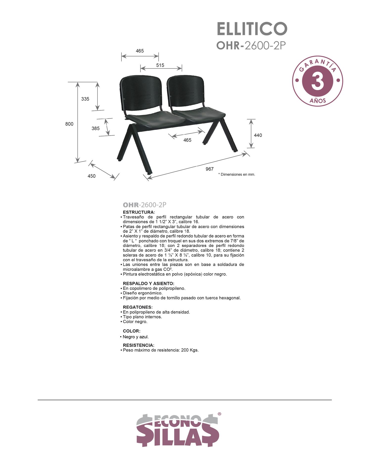 estructura: de acero tubular rectangular de 1 1/2" X 3", calibre 16, asientos y respaldos de perfil redondo tubular de acero con travesaños separadores tubulares redondos de acero con acabado de pintura epóxica (electrostática) color negro mate.