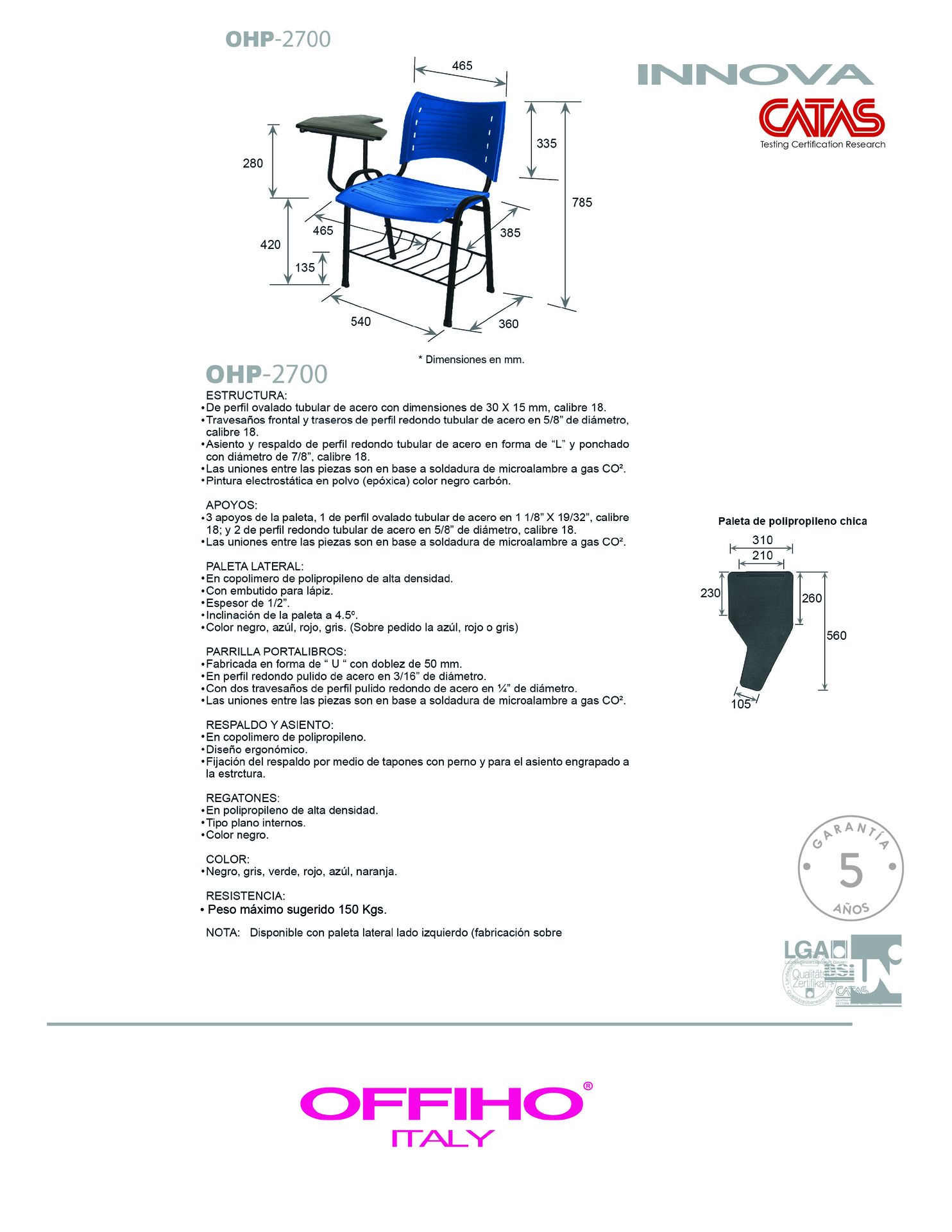asiento y respaldo: en dos piezas en polipropileno de alta resistencia y duración, con diversas perforaciones en forma de óvalo.