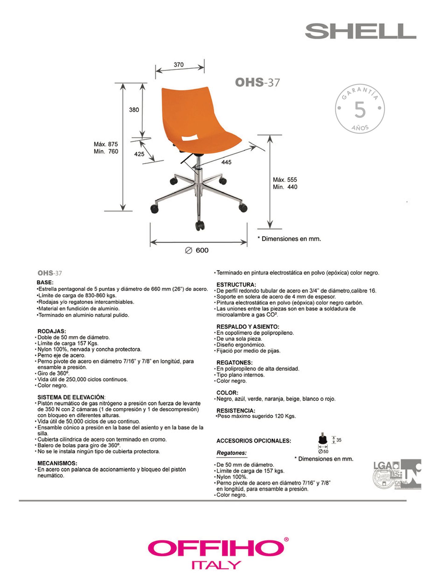 elevación: por medio de pistón neumático con terminado en cromo que permite ajustar la altura del asiento.