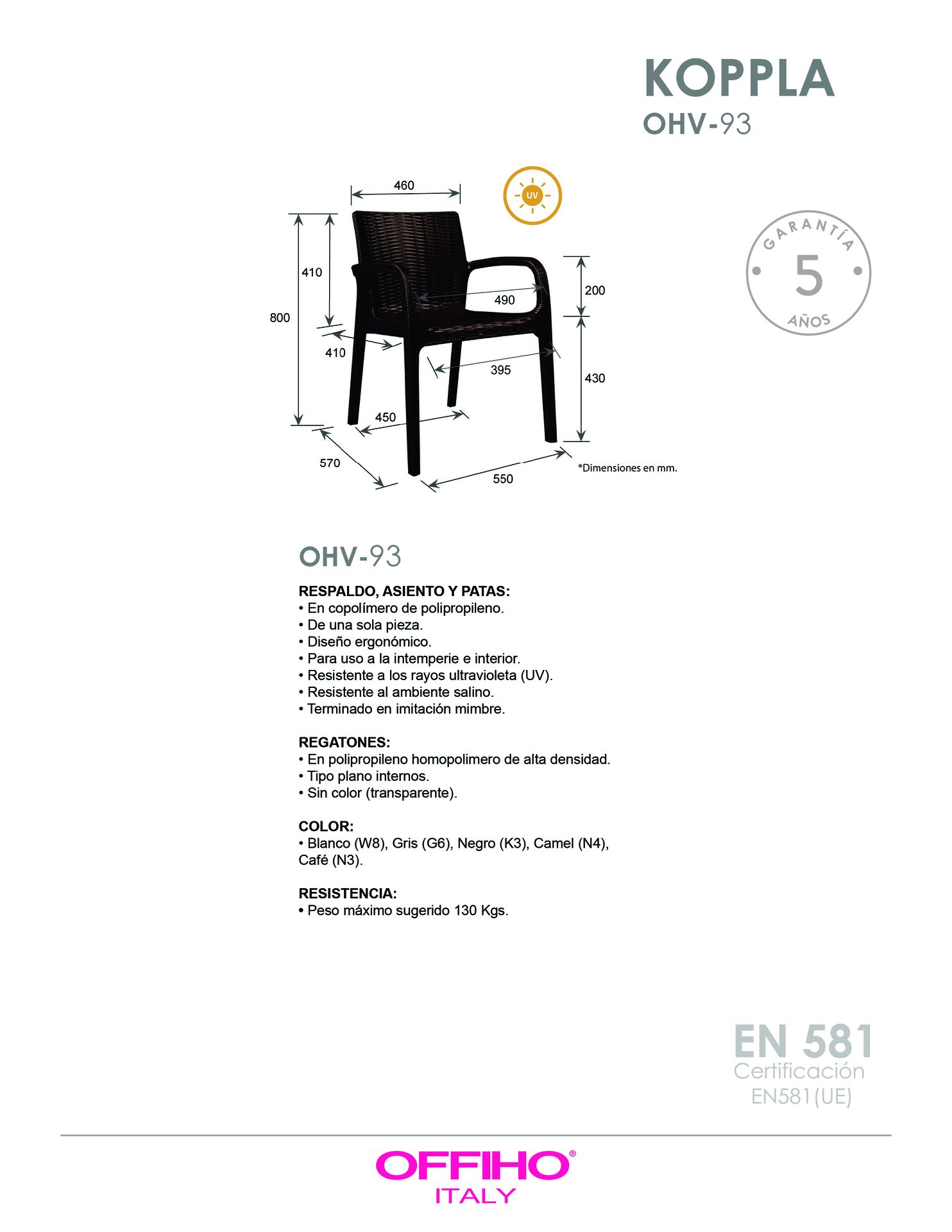 respaldo, asiento y patas: terminado en imitación mimbre de una sola pieza en polipropileno de alta resistencia y duración para intemperie, resistente a los rayos ultravioleta (UV) y al ambiente salino.